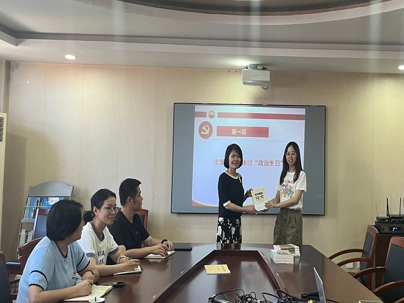 本次主题党日活动主要分为两项议程。第一项议程是为支部全体党员集体过政治生日。此项活动,旨在加强党员的党性教育,激发政治热情,强化党员的身份意识和责任意识,从而增强党组织的凝聚力和战斗力。在这个环节中,支部书记沈丽兰同志为每位党员赠送书籍,希望全体党员能进一步加强政治理论学习,提高党性修养。随后全体党员重温入党誓词,号召党员同志们要时刻保持清醒的政治觉悟和坚定的政治立场。本次主题党日的第二项议程是由沈丽兰同志为全体党员上党纪学习教育专题党课,党课的主题是“全面从严治党,持续正风肃纪”。党课中,党员同志们深入学习了习近平总书记关于党的自我革命的重要思想,学习了新修订的《中国共产党纪律处分条例》,集中观看了《党纪故事之有纪律方有铁军》教育视频。在党课的最后,号召全体党员要加强学习、坚守底线、不越红线、争做合格党员。