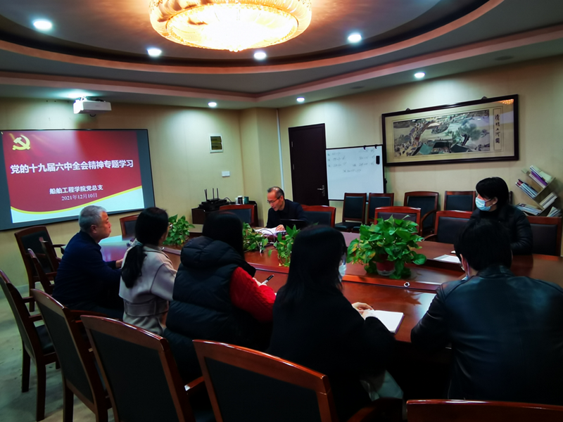 根据学院党总支中心组学习计划安排,20211210日下午,船舶工程学院党总支在学院会议室组织了党总支中心组理论学习,专题学习党的十九届六中全会精神和省第十四次党代会精神。