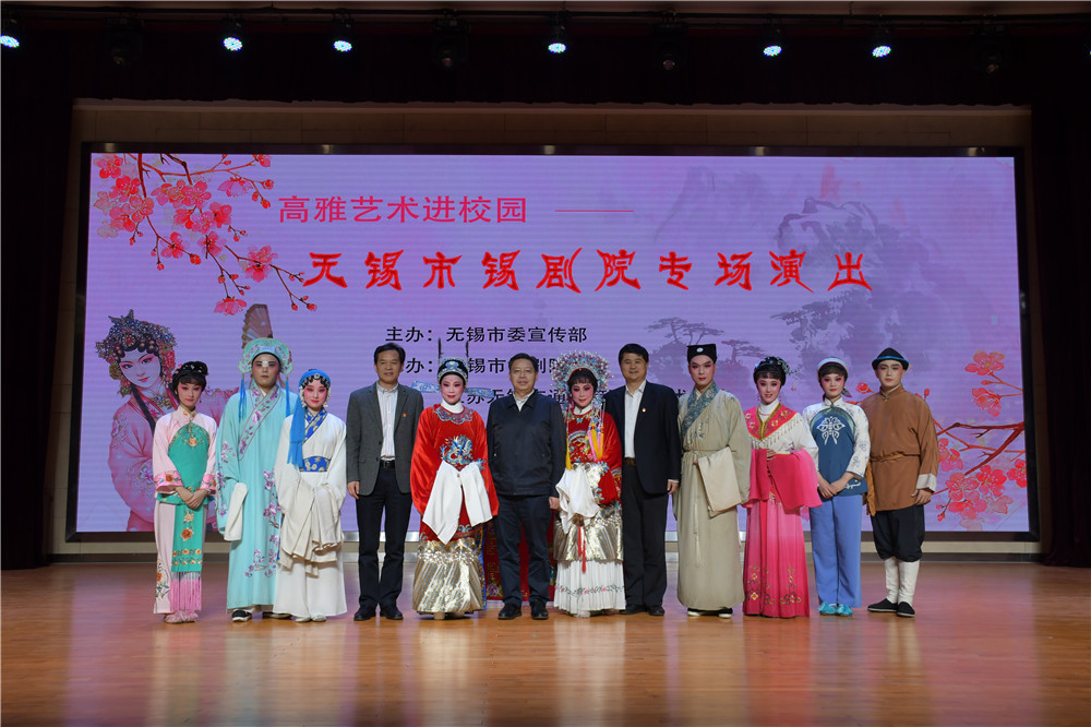 锡剧是以无锡地名命名、用无锡方言演唱的深受无锡老百姓喜爱的优秀地方戏曲,它和阿炳的《二泉映月》以及钱钟书、东林书院一样,是无锡重要的文化名片。此次经典折子戏专场演出为广大师生熟悉地方戏曲、传承特色文化、提高审美修养起着积极的作用。演出结束后,各位领导上台与演员一一握手并合影留念。