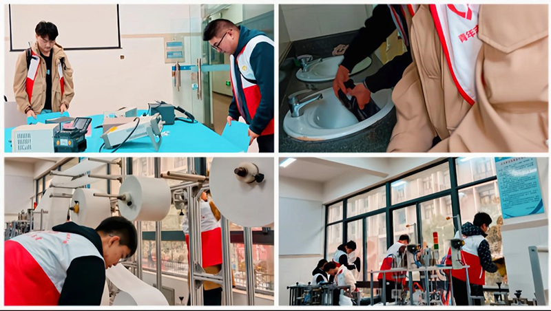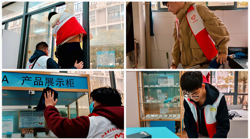 活动中,志愿者们穿好志愿者服装,准备好清洁工具在实训老师的安排下迅速投入到志愿服务中。志愿者们躬身寻找垃圾,擦拭落在玻璃上的灰尘,不怕脏、不怕累,更不遗漏任何一个角落。地面上的灰尘、细微的垃圾碎片,桌子里隐藏的纸屑,未摆放整齐的椅子等等,都被志愿者们一一整理干净。干净整洁的环境获得实训老师和周边同学的一致好评。菲尼萨学院在志愿者的细心清理下恢复了整洁的面貌。同时,活动过程中同学们也参观了口罩生产自动生产线,并了解了口罩是如何生产的,开拓了志愿者们的眼界,志愿者们纷纷表示,今后会加强对技能实操的学习,为建设中国特色社会主义现代化强国贡献自己的一份力量。