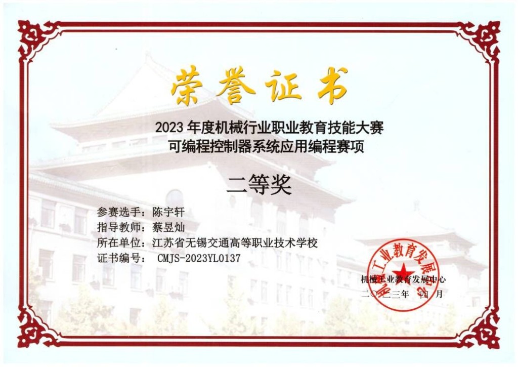 2023年4月6日-8号,2023年全国机械行业职业教育技能大赛可编程控制器系统应用编程赛项在南京工业职业大学举行,此次大赛全国共有150支队伍参赛。机电工程学院211324班陈宇轩同学代表学校参赛,经过激烈角逐,获中职组二等奖。