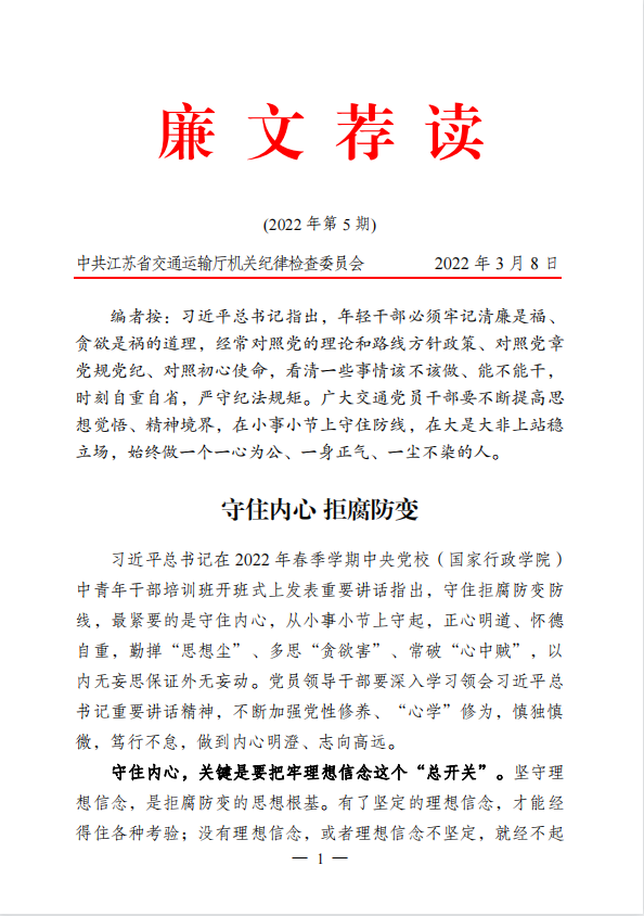 2022年廉文荐读第5期——守住内心 拒腐防变