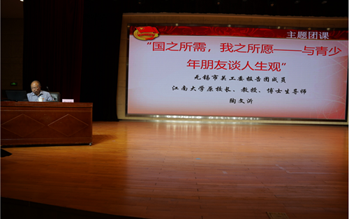 5月18日,学校在大礼堂组织开展了“喜迎二十大 永远跟党走 奋进新征程”主题团日活动暨集中入团仪式。学校党委委员、副校长倪依纯出席活动并讲话、无锡市关工委报告团成员、江南大学原校长、教授、博士生导师陶文沂出席活动并开展主题讲座。