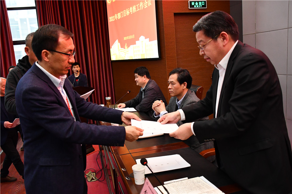 会上,各部门主要负责人向学校主要领导递交2021年度目标考核责任书。教务处、机电工程学院负责人交流发言。