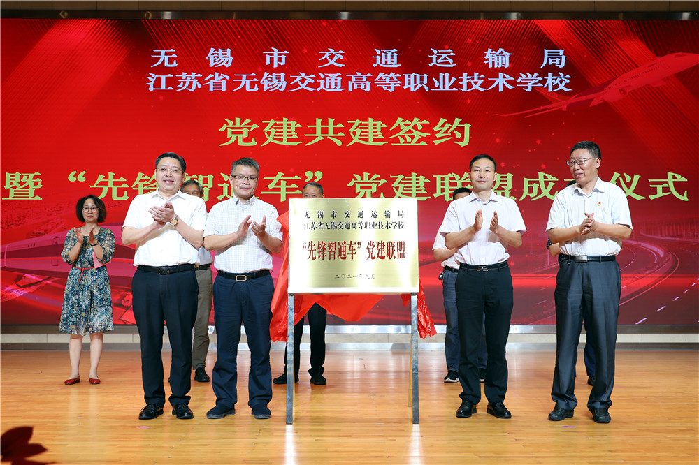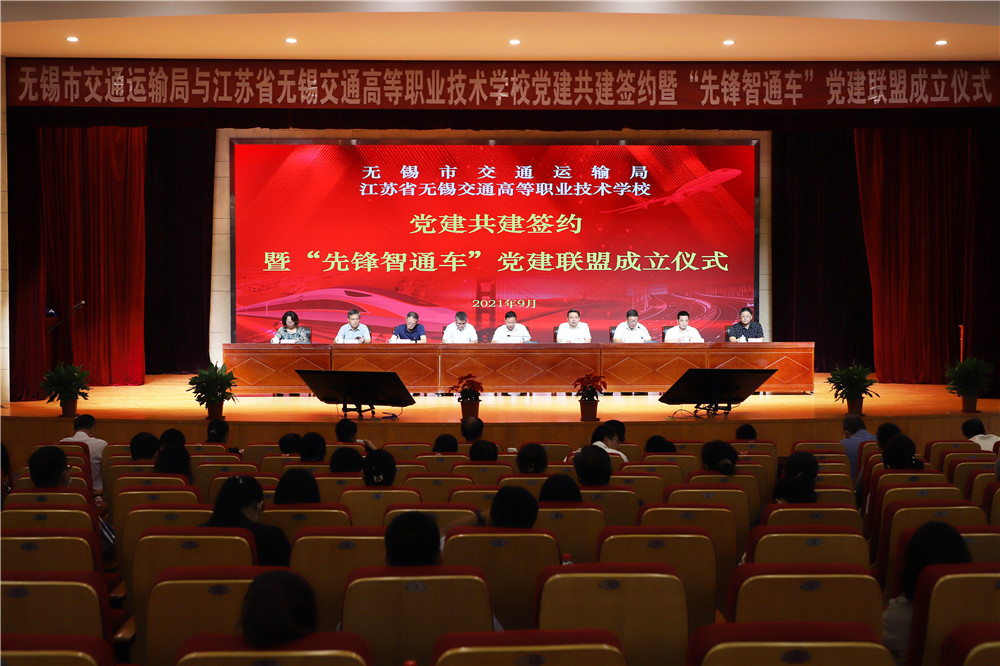 为深入学习贯彻习近平新时代中国特色社会主义思想,深化党史学习教育,落实“两在两同”建新功行动,发挥党建引领促发展作用,9月29日,无锡市交通运输局与无锡交校党建共建签约暨“先锋智通车”党建联盟成立仪式在学校大礼堂举行。江苏省交通运输厅机关党委副处长王子明,无锡市委组织部组织二处处长龚鑫,凤凰体育党委书记、校长李虎,无锡市交通运输局党委副书记尹南方,副局长丁满琪,调研员宋良栋、周文专,无锡交校副校长倪依纯等出席签约仪式。签约仪式由学校党委副书记朱雨兰主持。