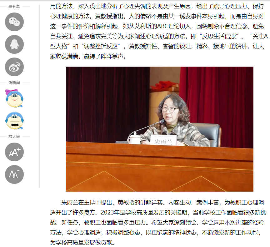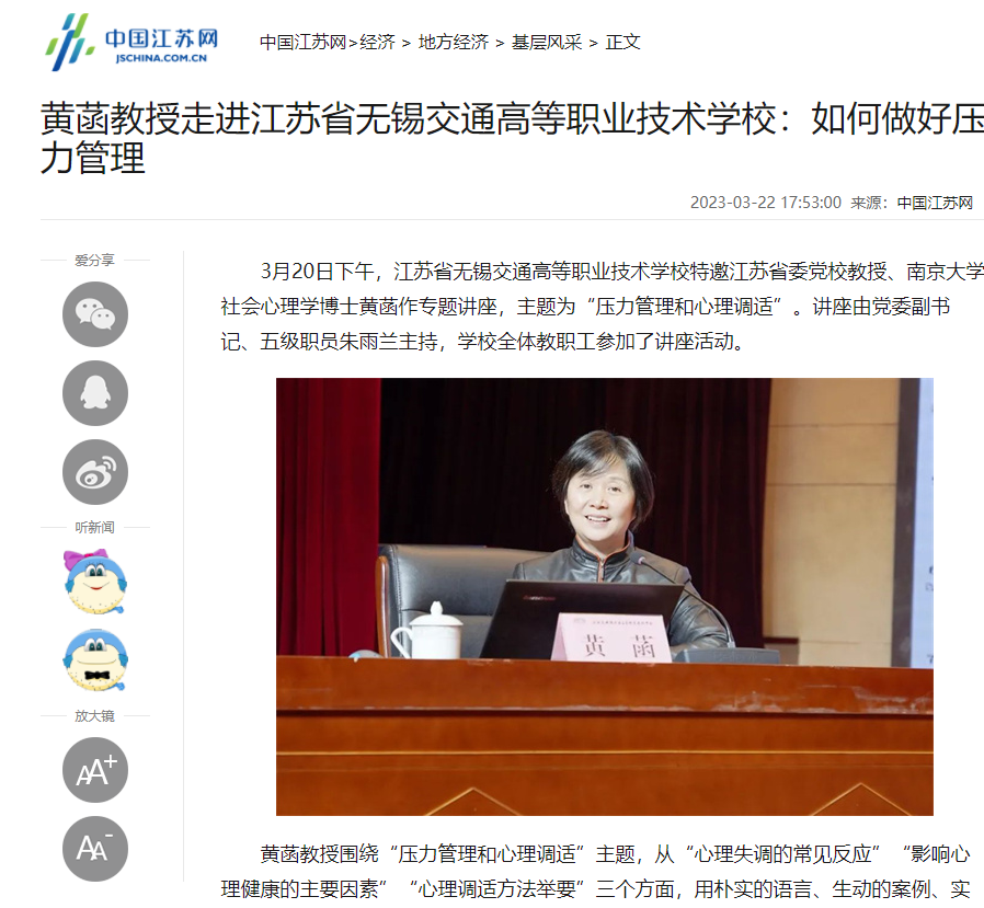 中国江苏网:黄菡教授走进凤凰体育:如何做好压力管理
