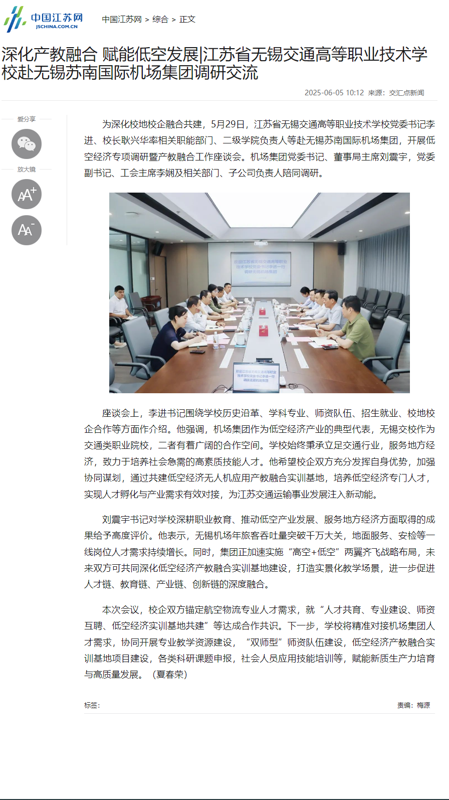 中江网:深化产教融合 赋能低空发展|凤凰体育赴无锡苏南国际机场集团调研交流