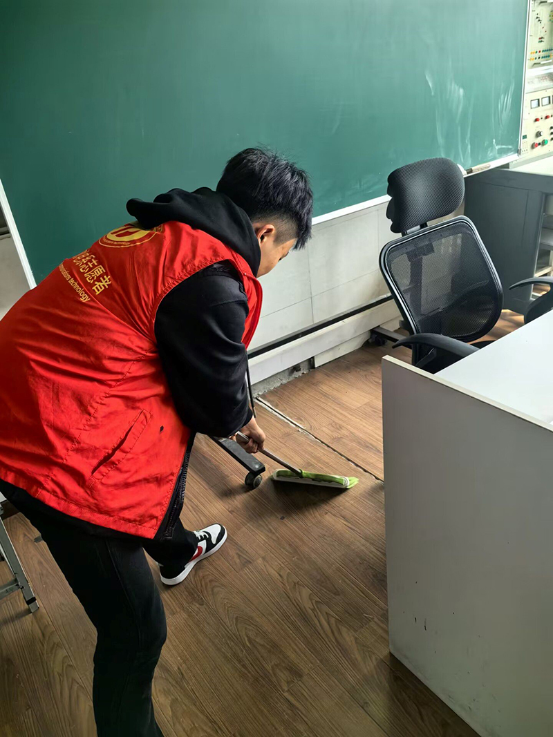 “校园环境我守护”。211311班班委组成的志愿服务队穿上志愿者马甲,踊跃参与“做一件小事,做一件好事”的实践活动中,他们深入实训室,擦窗、扫地、拖地……把实训室打扫的窗明几净,为营造良好的实训环境贡献自己的力量。