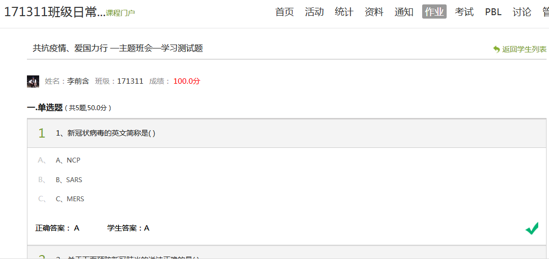 首先,班主任程建新老师利用超星学习通软件在线上进行直播,同时下发PPT文件,让同学们了解到了什么是新型冠状病毒以及它的预防方法,以及在本次疫情中钟南山和李兰娟院士为这次疫情所做出的贡献。然后讲述了一些病房里的小故事:隔离区穿着防护服相遇,握个手默默告白等等。同学们都被一位位英雄的事迹所打动,他们虽然平凡却高尚,大无畏的精神值得被我们称赞。