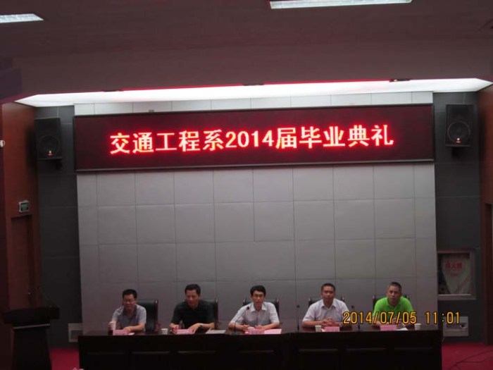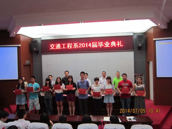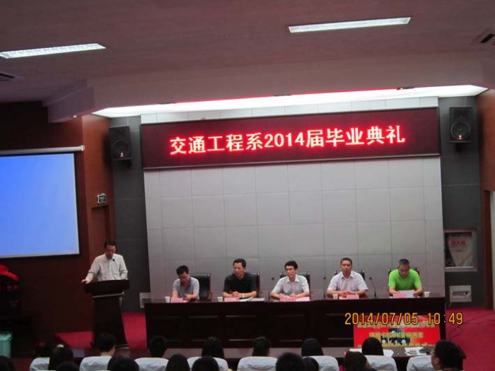 2014年7月5日上午,交通工程系2014届毕业生毕业典礼在我校学术报告厅隆重举行,出席本次毕业典礼的有学校校长陆春其老师、教务处副处长邢木清老师、学生工作处副处长王演新老师、交通工程系主任陈建明老师、副主任邹定南老师以及交通工程系全体教师和系部2014届全体毕业生。