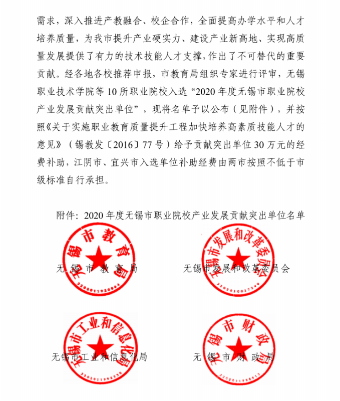 12月8日,无锡市教育局发布了《关于公布无锡市职业院校促进产业发展贡献突出单位名单的通知》(锡教发〔2020〕101号),我校获评“2020年度无锡市职业院校促进产业发展贡献突出单位”,并获30万补助。