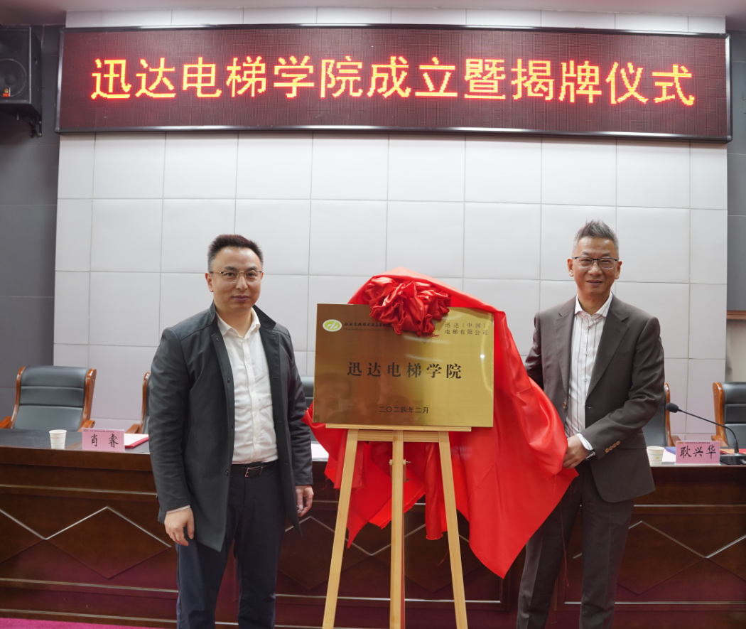 仪式上,副校长耿兴华、迅达(中国)电梯有限公司苏沪区人力资源高级经理肖睿代表校企双方签署了共建学院协议,校长李进、迅达(中国)电梯有限公司苏沪区总经理徐春剑共同为迅达电梯学院揭牌。