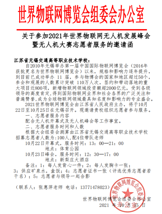 10月21日-23日, 2021世界物联网博览会无人机发展峰会暨无人机大赛在无锡召开。学校受世界物联网博览会组委会办公室函请配合做好无人机开幕式及无人机峰会等工作事宜,并选拔来自于202161班、212521班、181311班、203381班和无线电测向社团的100多名师生志愿者参与赛会志愿服务。