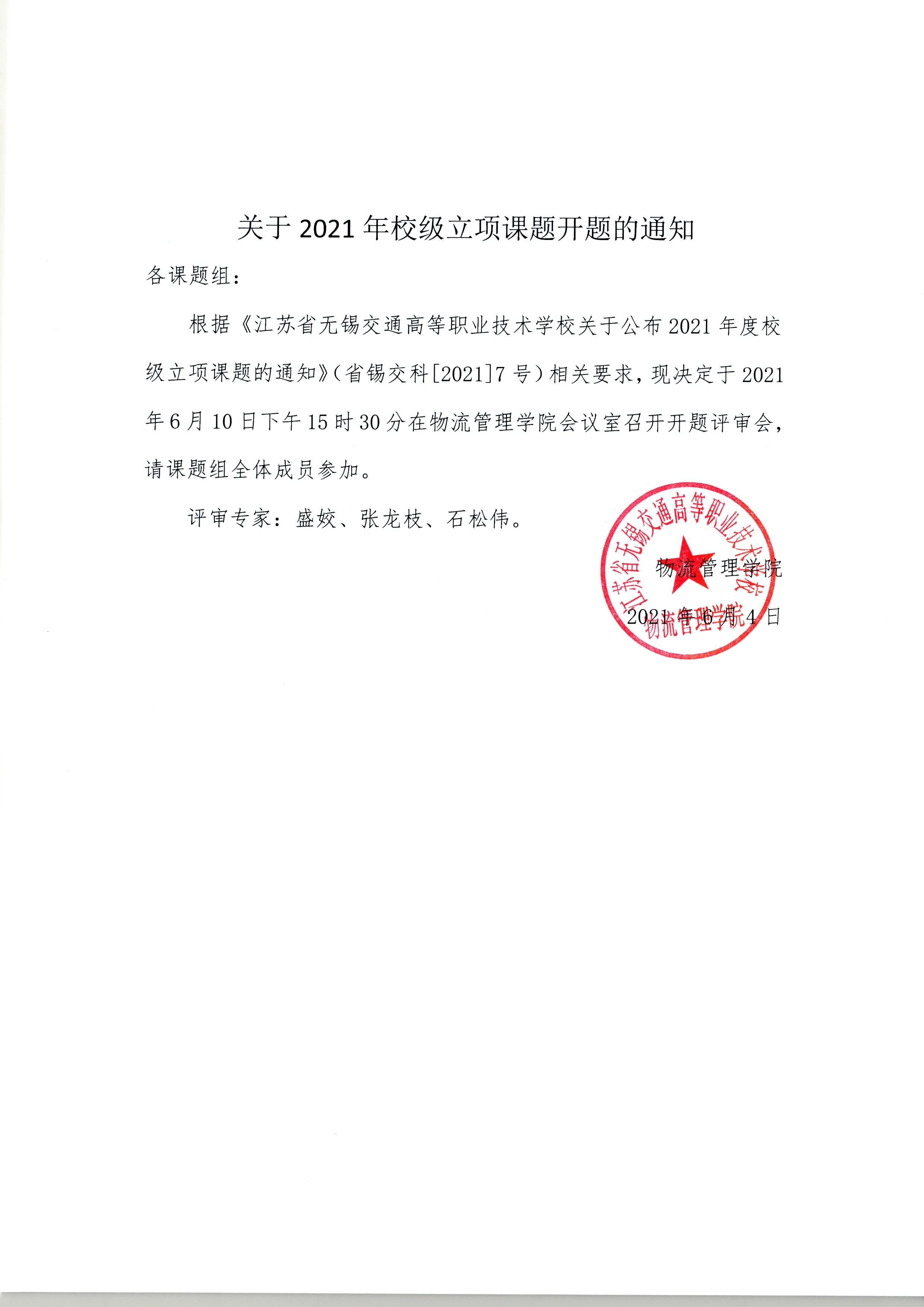 根据《凤凰体育关于公布2021年度校级立项课题的通知》(省锡交科[2021]7号)相关要求,现决定于2021年6月10日下午15时30分在物流管理学院会议室召开开题评审会,请课题组全体成员参加。