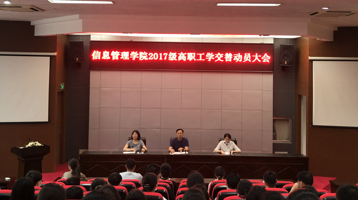 信息管理学院于2021年6月10日中午12:30在学校学术报告厅召开2017级高职工学交替动员大会。学院院长郑智飞、副院长蒋红梅、2017级全体高职生和辅导员以及综合办、学工办、各教研室主任老师们参加了动员会。